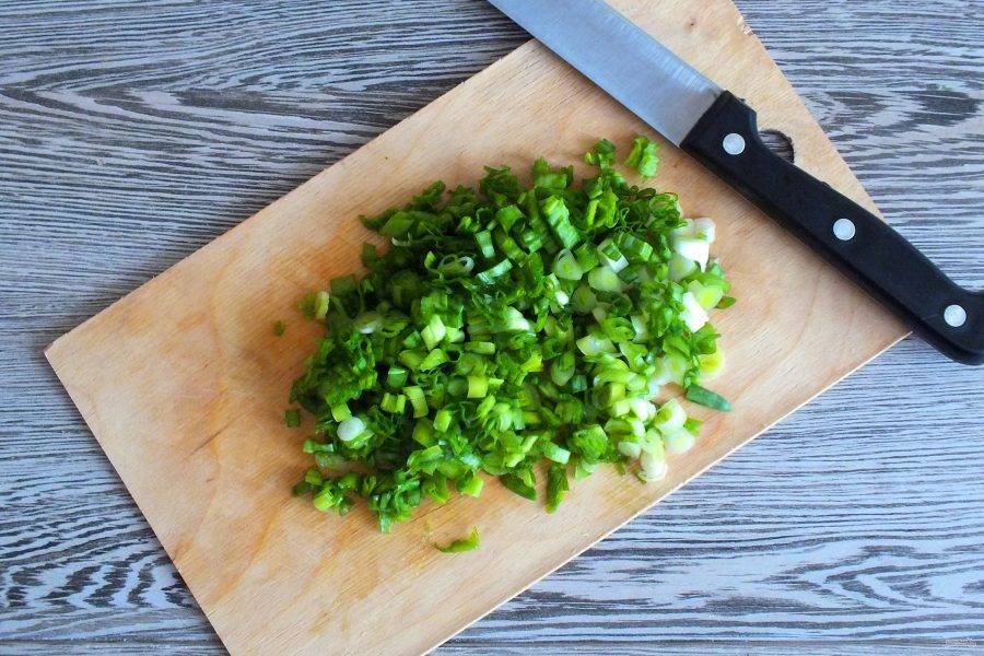 Зеленый лук вымойте, просушите. Мелко нарежьте.