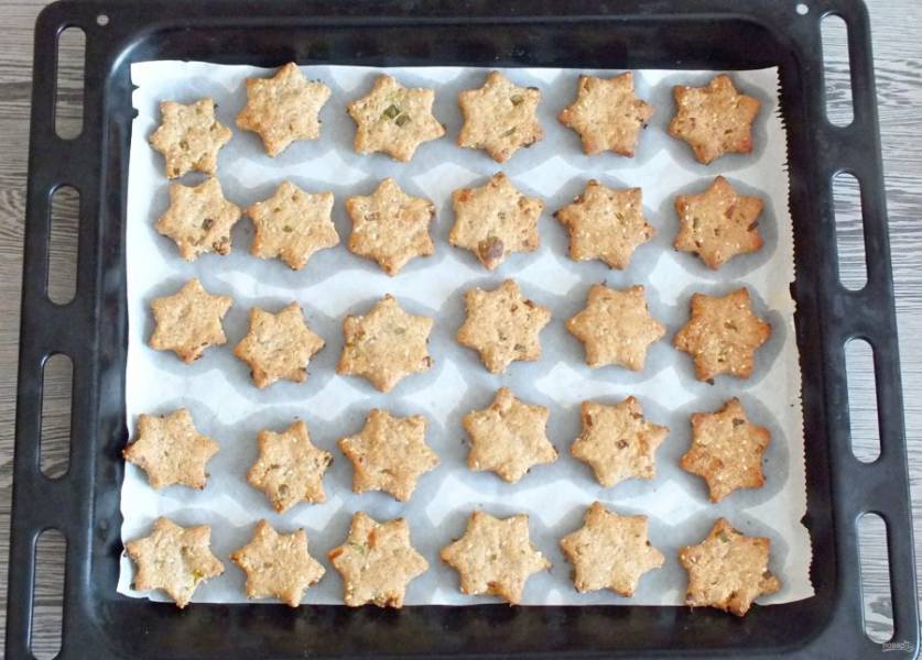 Переложите будущее печенье на противень застеленный пергаментной бумагой. Поставьте выпекаться в разогретую до 200 градусов духовку на 12-15 минут. Время зависит от толщины нарезанного печенья. Также учитывайте особенности своей духовки.