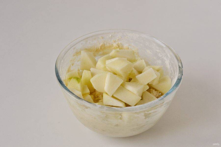 Яблоки очистите от кожуры, нарежьте маленькими ломтиками. Добавьте в тесто и тщательно перемешайте.