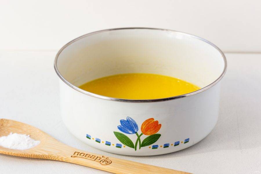 Добавьте в масло яйца, мед, сахар, соду и соль. Взбейте миксером или венчиком.