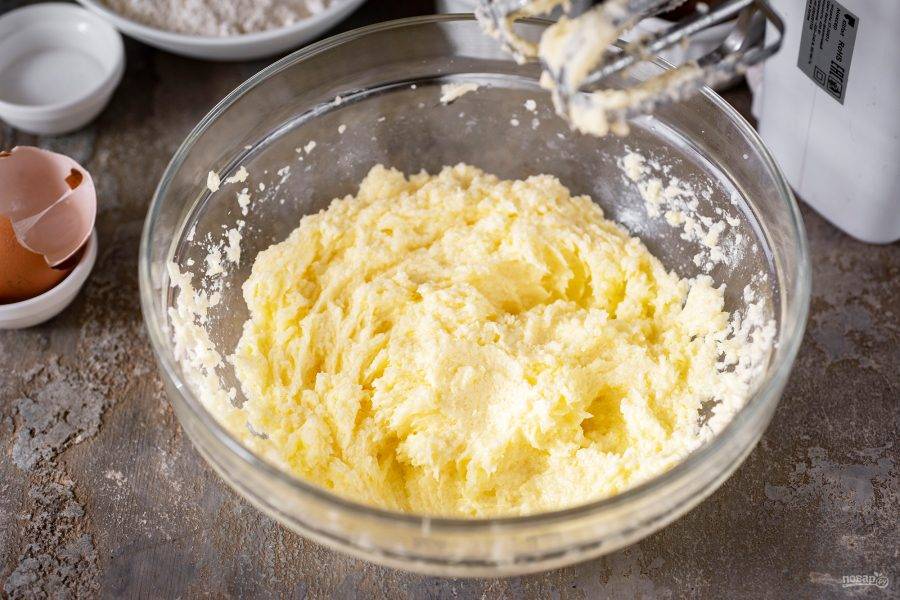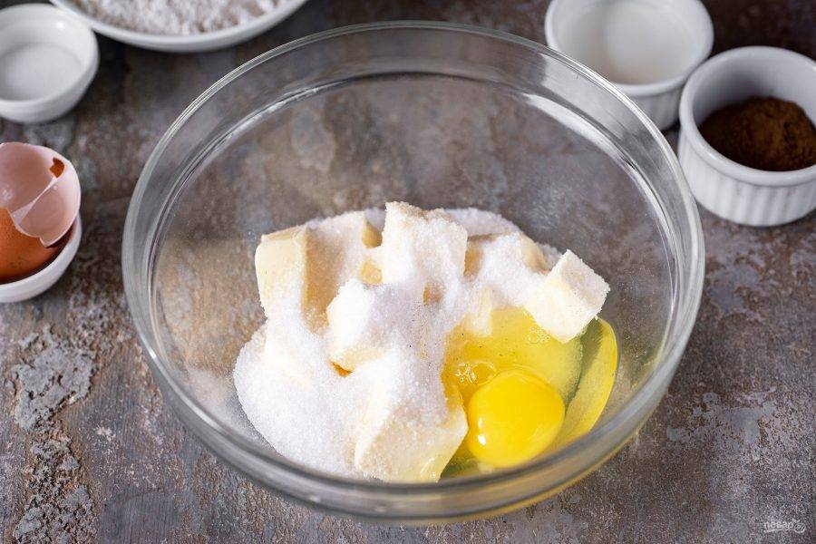 В просторную миску выложите мягкое сливочное масло, добавьте 100 грамм сахара, вбейте яйцо.