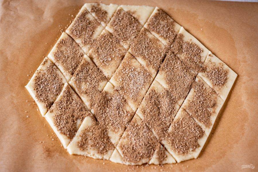 Затем охлажденное тесто раскатайте прямо на пергаменте для выпекания в пласт толщиной примерно в 0,5 см. Ножом нарежьте пласт теста на ромбы и каждый ромб обильно присыпьте смесью корицы и сахара (20 грамм). Отправьте печенье выпекаться в уже разогретую до 180 градусов духовку на 15-20 минут.