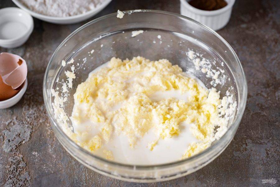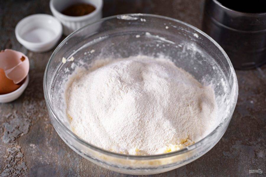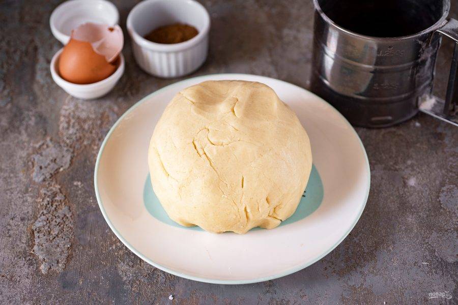 Все ингредиенты перемешайте, замесите мягкое тесто, которое может чуть прилипать к пальцам. Тесто округлите, оберните в пищевой полиэтиленовый пакет, положите на полку холодильника на 30 минут.