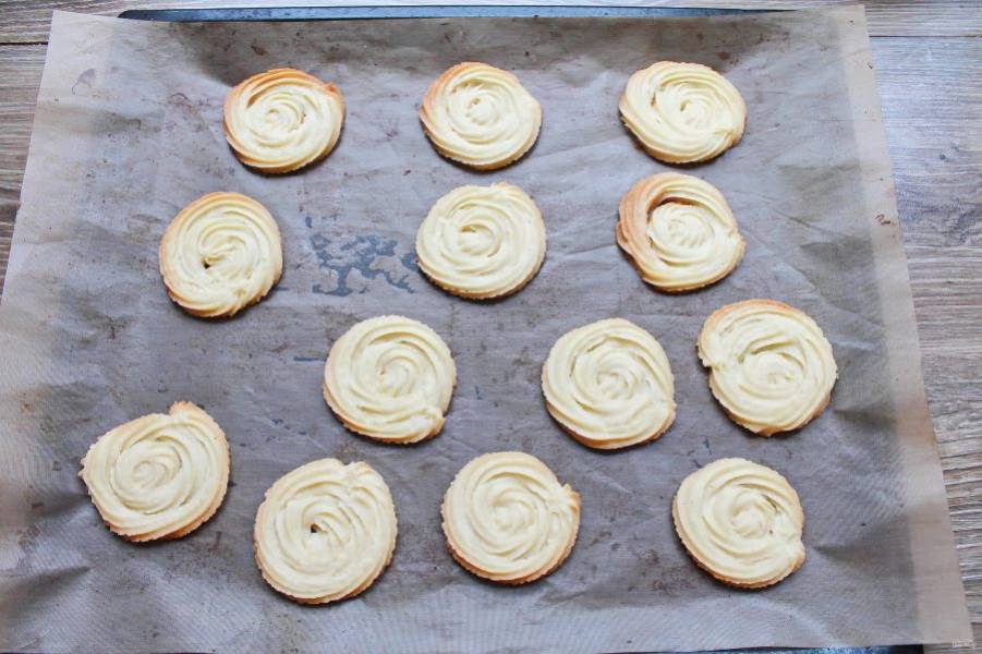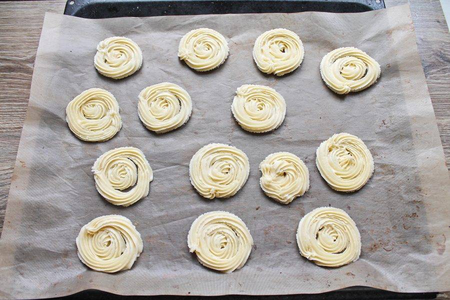Переложите тесто в кондитерский мешок с насадкой звездочка. Противень застелите бумагой для выпечки или специальным ковриком и отсадите на расстоянии 2 сантиметра круглые печенья, начиная с его центра. Поставьте в холодильник на один час.