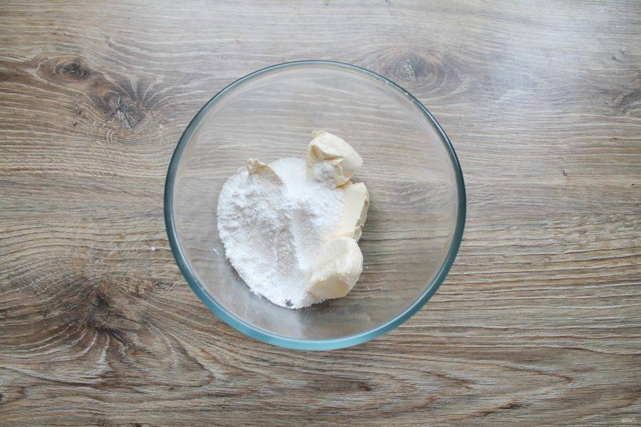 В миску выложите мягкое масло и добавьте сахарную пудру, ванилин. Взбивайте на высокой скорости до пышной массы в течение 5 минут.