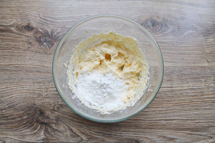 В миску с взбитой массой просейте через мелкое сито муку.