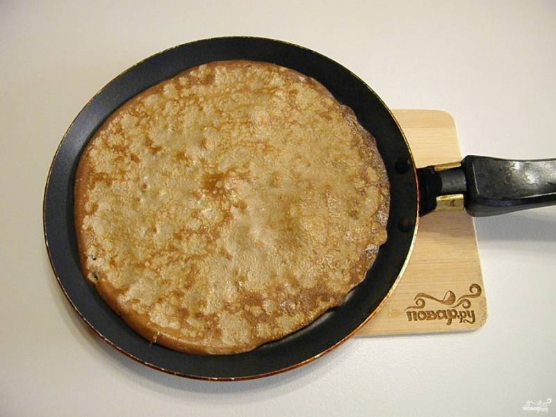 Смажьте при помощи силиконовой кисточки антипригарную сковороду маслом, разогрейте его хорошо, а затем половником наливайте тесто. Жарьте с обеих сторон блины до румяной корочки.