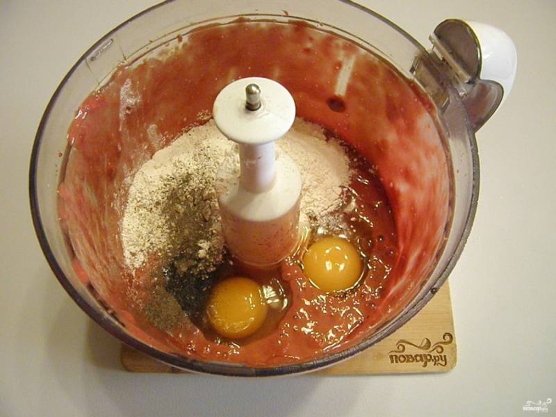 Добавьте к печени яйца, соль, перец черный молотый, муку. Снова включите блендер на максимальную мощность.
