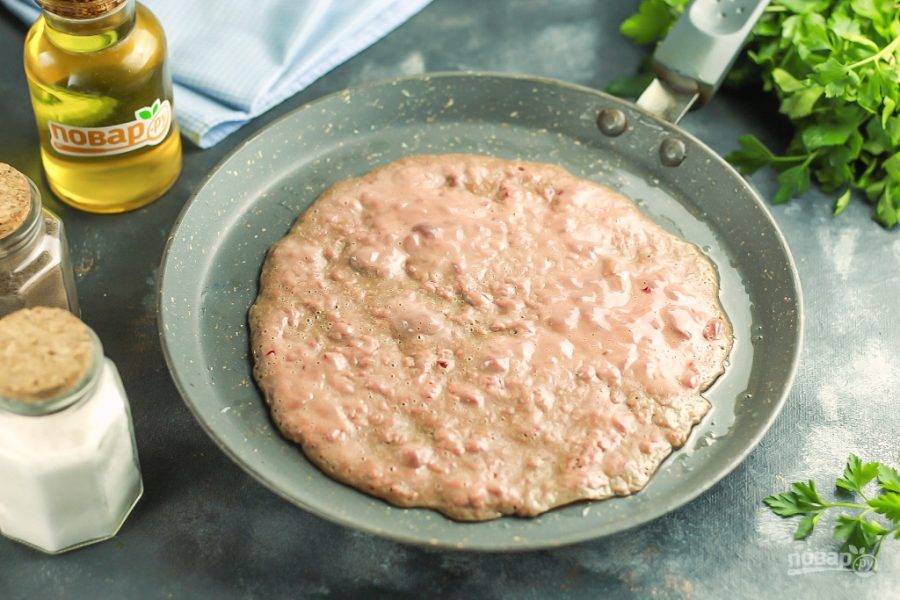 Разогрейте сковороду и влейте 5-10 мл. растительного масла в первый раз. Половину половника теста влейте в сковороду и слегка растяните по дну. Не выпекайте слишком широкие блинчики, так как они могут рваться при закручивании. Обжарьте их по 2 минуты с каждой стороны, переворачивая широкой лопаткой.