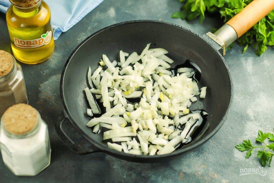 Очистите лук от кожуры, промойте в воде вместе с шампиньонами. Нарежьте луковицу мелкими кубиками и отпассеруйте примерно 3-4 минуты в растительном масле на прогретой сковороде. Не добавляйте грибы и лук вместе, так как грибы выпустят сок и нарезка лука станет вареной, а не жареной.