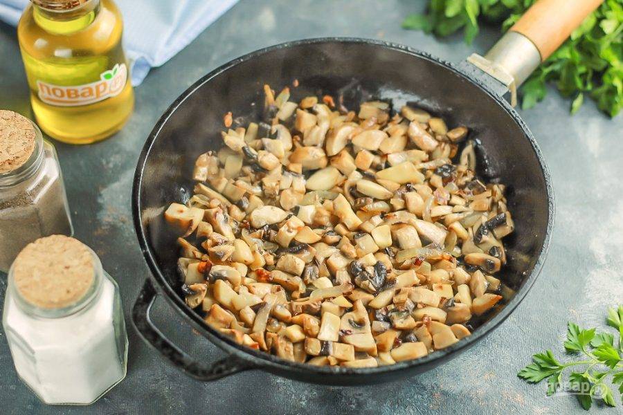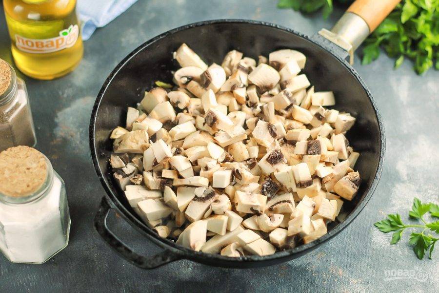 Нарежьте шампиньоны мелкими кубиками и добавьте в сковороду. Посолите нарезки и перемешайте. Обжаривайте примерно 6-8 минут, пока из грибов не выпарится вся жидкость и они не подрумянятся.