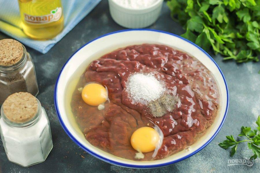 Вырежьте из печени жилы и пленки, нарежьте кусочками и пропустите через мясорубку в глубокую емкость, установив в ней решетку с мелкими отверстиями. Вбейте туда же куриные яйца, всыпьте соль и молотый черный перец.