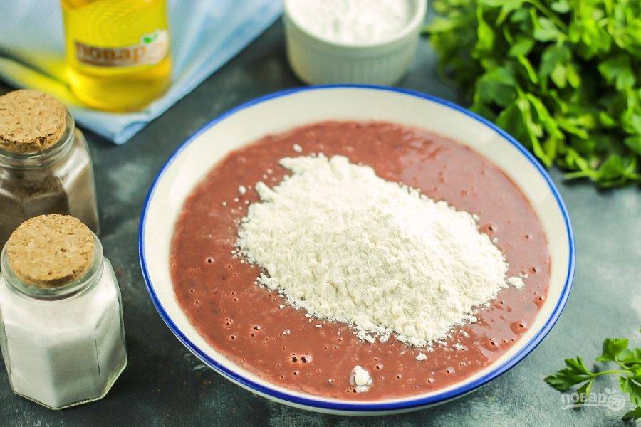 Влейте воду и все взбейте вилкой или венчиком. Затем всыпьте пшеничную муку и вмешайте ее в печеночную массу. Последним влейте растительное масло. Перемешайте тесто и оставьте на 15-20 минут в покое.