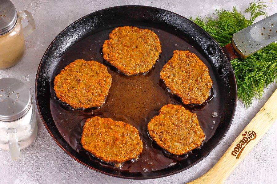 Раскалите сковороду с растительным маслом и столовой ложкой выложите в него части приготовленного печеночного теста. Обжарьте на умеренном нагреве по 1-2 минуте до румяности.