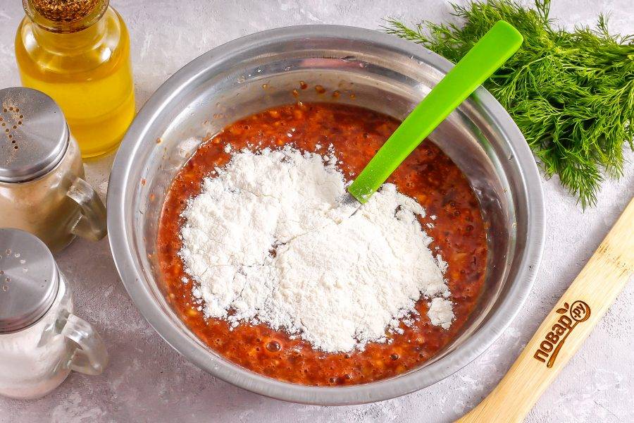 Всыпьте пшеничную муку и еще раз все вымешайте. Оставьте фарш на 15 минут для отдыха. Он не должен быть густым! Его консистенция должна быть такой же, как тесто для оладий.