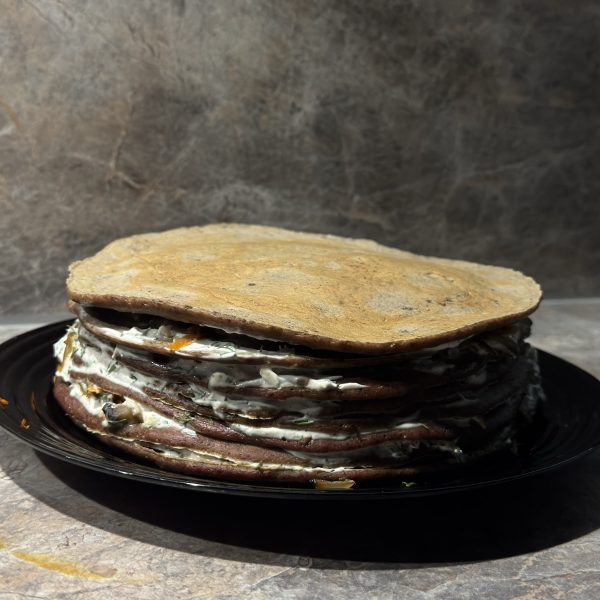 Пожарьте блинчики из печеночного теста и смажьте их соусом на основе йогурта, зелени и чеснока. Торт получается сытный и питательный!