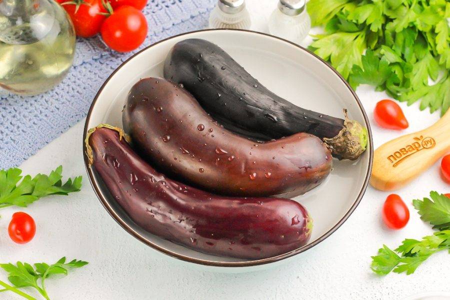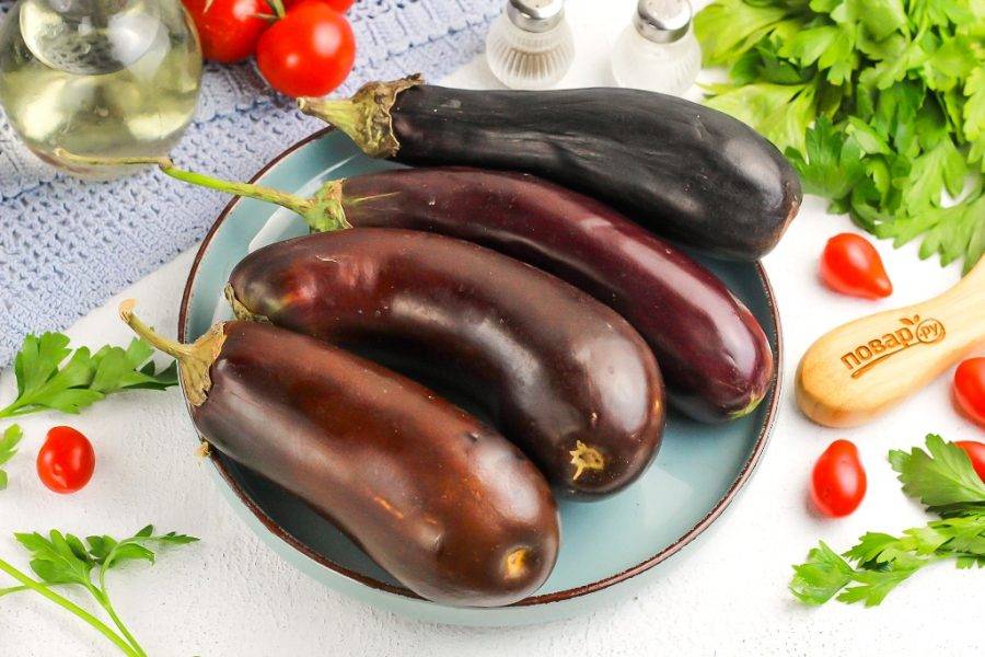 Подготовьте указанные продукты. Приобретите плотные баклажаны любого сорта. Выбирайте не слишком крупные плоды, чтобы в них не было жестких семян.