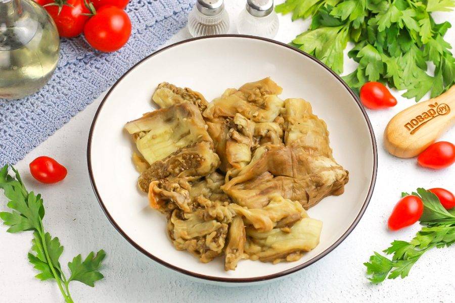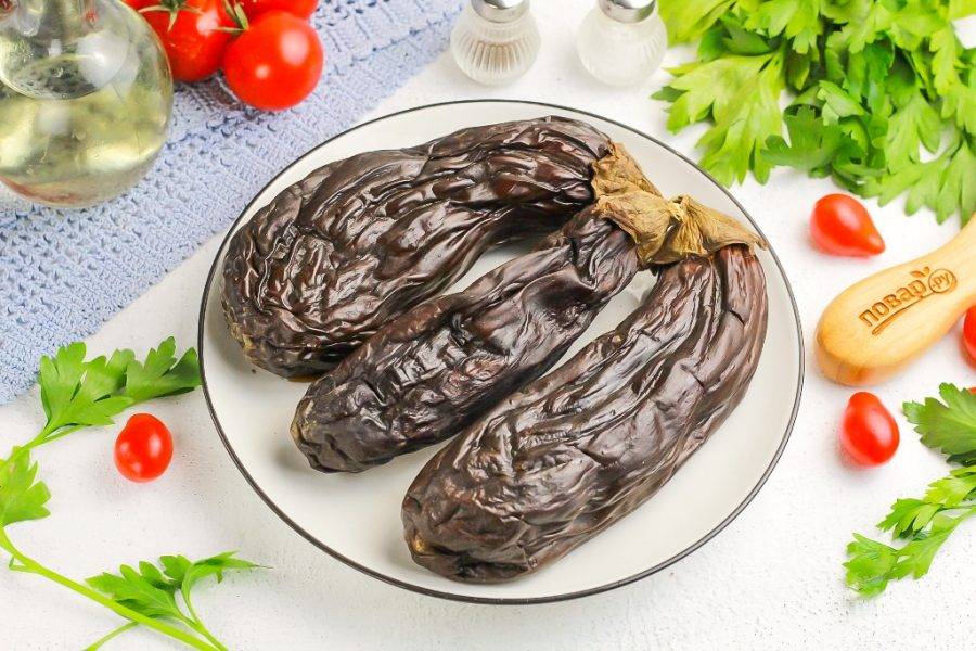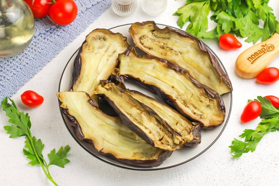 Остудите в течение 10 минут, разрезав каждый баклажан пополам. Таким образом они быстрее остынут.