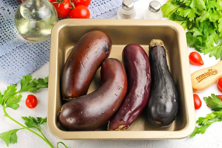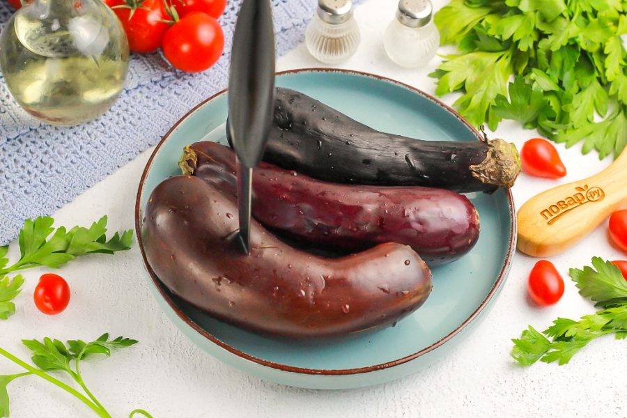 Обязательно несколько раз проткните каждый баклажан в разных местах, иначе он лопнет при запекании и может забрызгать всю духовку. Это можно сделать с помощью ножа или вилки.