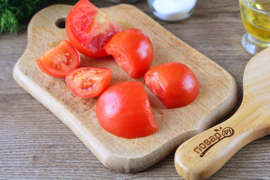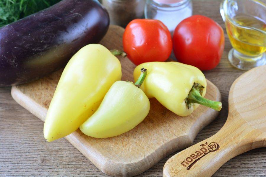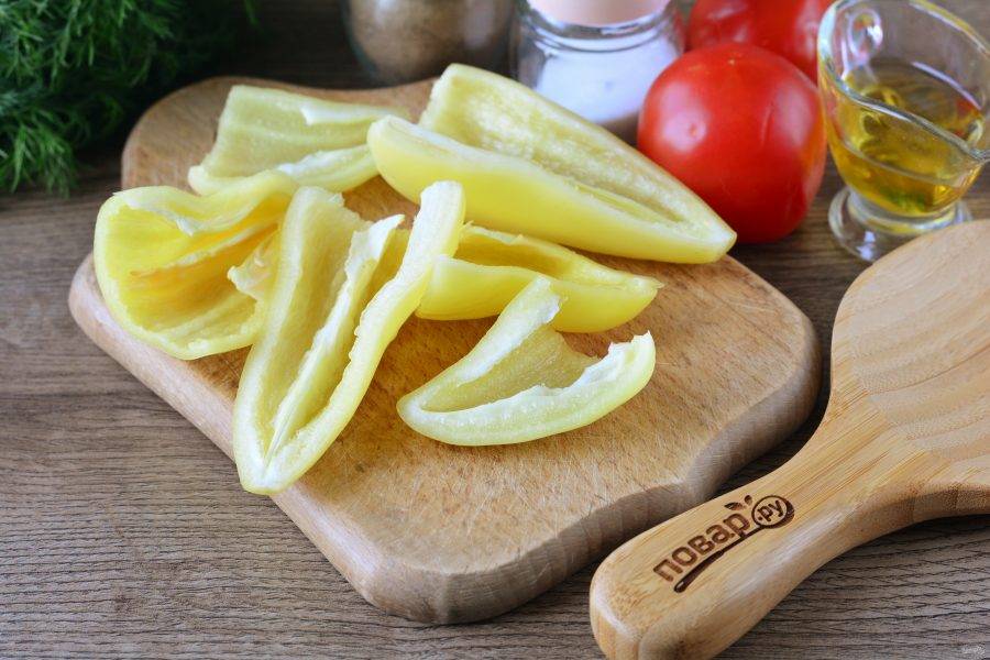 Промойте сладкий перец, срежьте хвостики, разрежьте плоды пополам и извлеките семена. Перец оставьте половинками.
