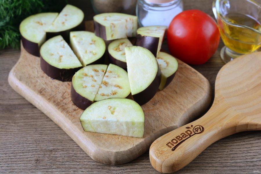 Срежьте хвостики с баклажанов, овощи нарежьте крупными полукольцами.