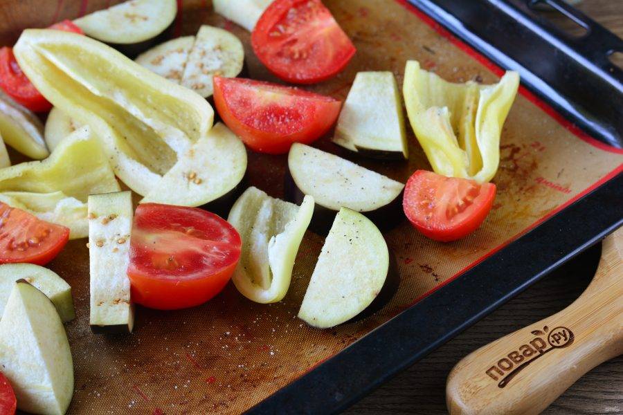Все овощи выложите на противень, присыпьте солью и слегка полейте маслом.