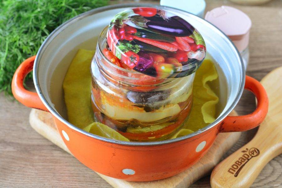 В кастрюлю с теплой водой поставьте банку с овощами и стерилизуйте 10-15 минут после закипания воды.