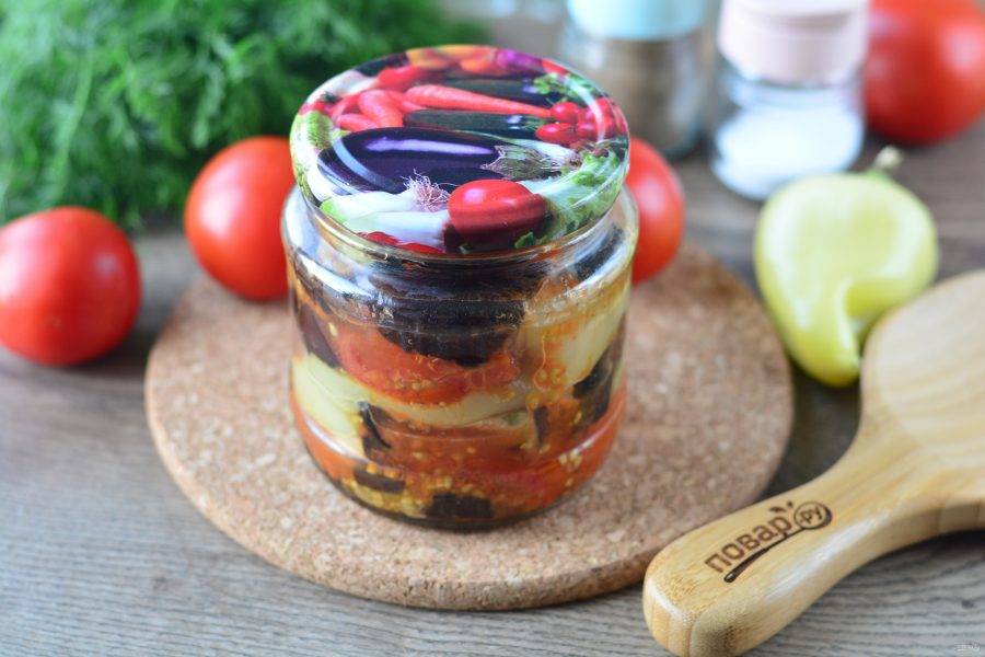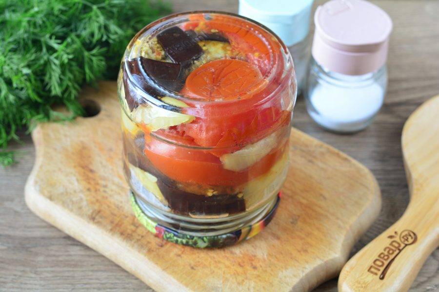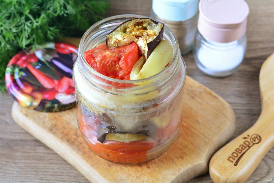 Овощи разложите в чистые простерилизованные баночки, чередуя слоями помидоры, перец и кусочки баклажанов. Овощи слегка утрамбовывайте, чтобы оставалось как можно меньше пространства.