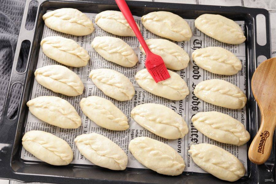 Перенесите пирожки на противень, застеленный специальным ковриком или, как у меня, силиконизированным пергаментом. Можно просто смазать противень растительным маслом.