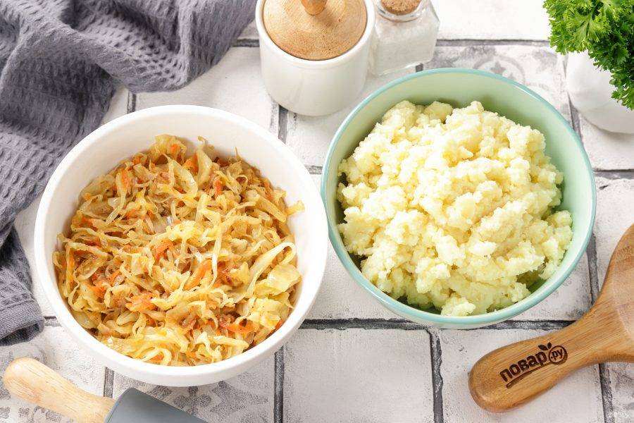 Начинка у меня сегодня самая любимая в нашей семье — тушёная капуста и картофельное пюре, я её приготовила заранее, чтобы не отвлекаться. Вы можете взять любую начинку: рис с грибами, фарш, печень, зелёный лук с яйцами или приготовить сладкие начинки.
