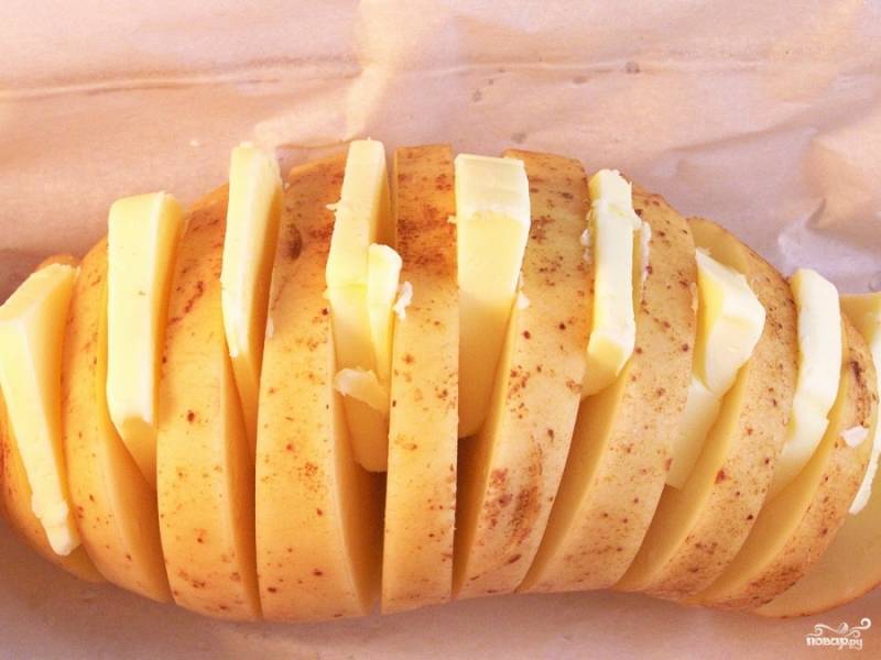 2. Ломтиками нарезаем пармезан и сливочное масло. Вкладываем в разрезы картофеля по очереди. Отправляем картофель в разогретую духовку и запекаем при температуре 200 градусов примерно 45 минут.