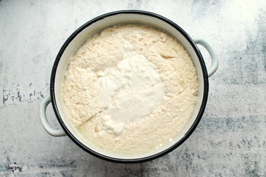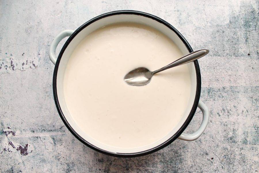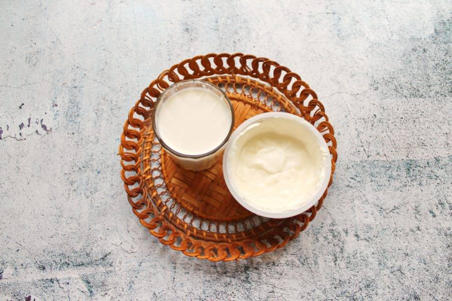 Смешайте теплое молоко со сметаной до однородности и уберите в теплое место на 8-12 часов для заквашивания.