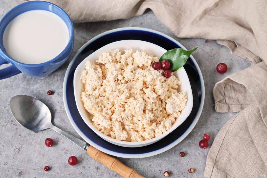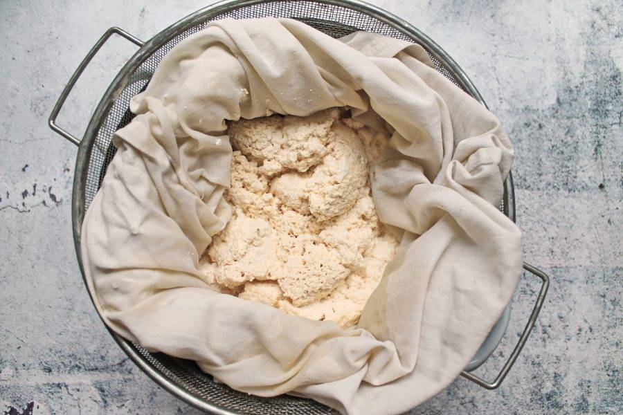 Дуршлаг застелите плотной тканью и вылейте массу, завяжите концы. После этого подвесьте и дайте стечь сыворотке. На это уйдет примерно 2 часа. После этого переложите готовый творог в тарелку и подавайте к столу.