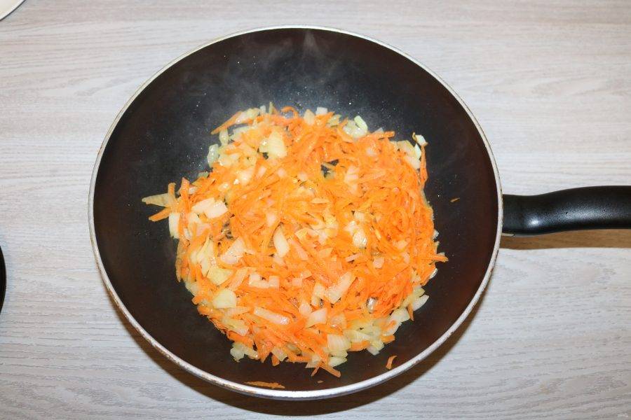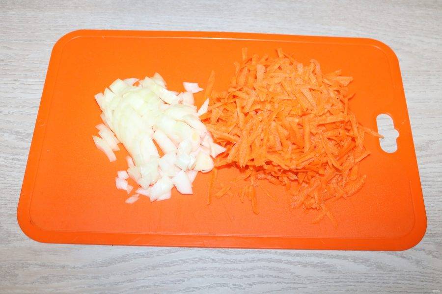 Лук нарежьте кубиками, морковь натрите на крупной тёрке.