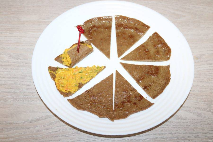 На каждую часть выложите по чайной ложке начинки, сверните рулетиком.