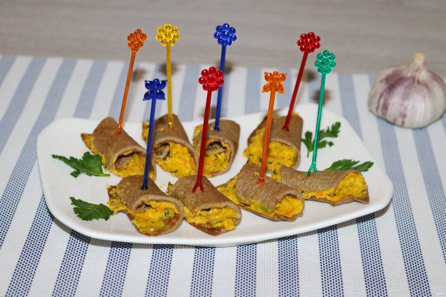 Закрепите шпажкой каждый рулетик, подавайте к столу.