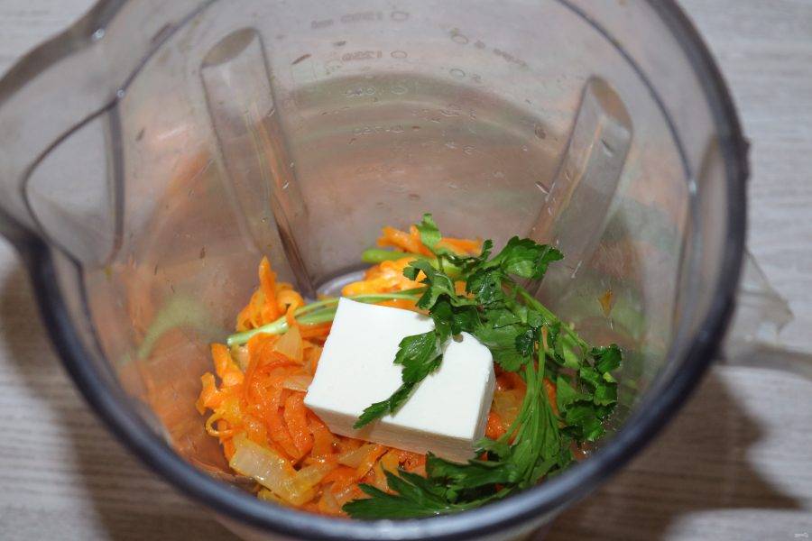 Поместите в чашу блендера обжаренную морковь, лук, сливочный сыр и петрушку. Взбейте всё до получения однородной массы.