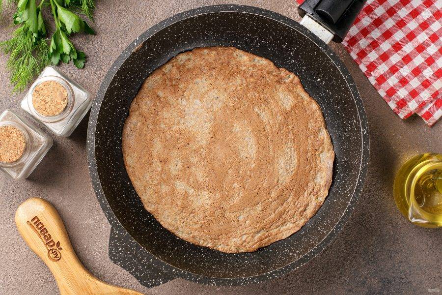 Разогрейте сковороду и смажьте маслом. Налейте половником небольшое количество теста и распределите по всей сковороде, чтобы получился блинчик. Обжарьте с двух сторон до готовности.