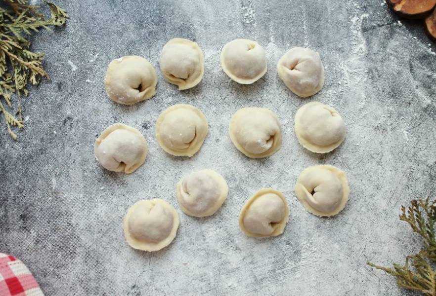Слепите пельмени любым удобным способом. Готовые пельмени разложите на подносе, посыпанный мукой, в один слой.