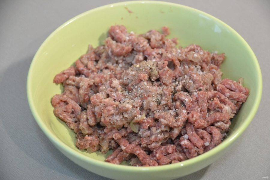 Пока тесто доходит до кондиции, подготовьте мясной фарш. Фарш посолите, поперчите, добавьте луковицу. Перемешайте.