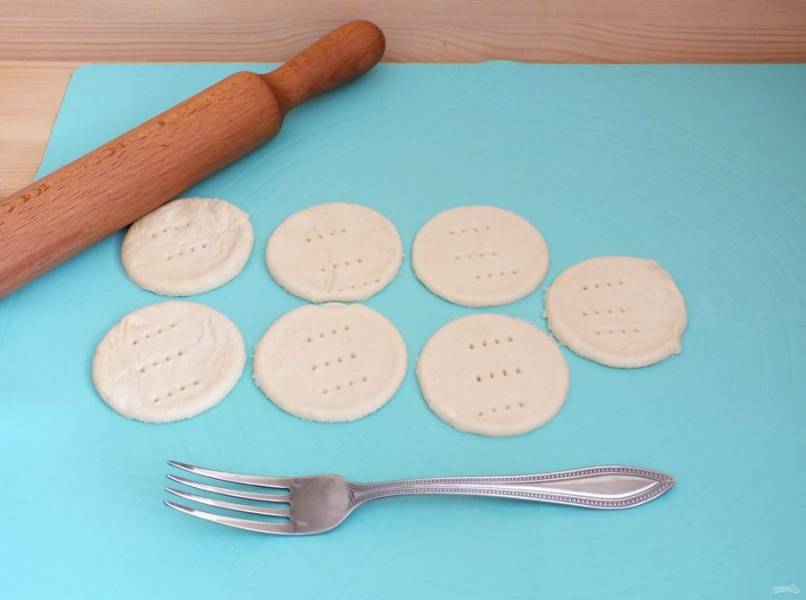 Возьмите слоёное тесто. Если оно рулоном, то разрежьте на две половины. Возьмите одну часть теста. Раскатайте потоньше. С помощью стакана вырежьте круги. Из обрезков теста скатайте шар, и повторите процесс.