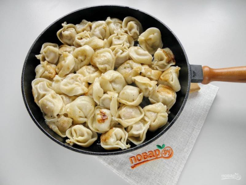 Разогрейте сковороду, влейте растительное масло, положите пельмени, залейте стаканом воды. Закройте крышкой сковороду и жарьте пельмени, периодически помешивая их лопаткой, в течение 10 минут.