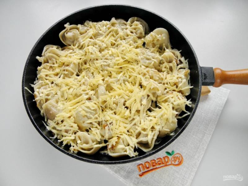 Натрите сыр на крупной терке. Распределите сыр по горячим пельменям. Закройте крышкой сковороду и оставьте пельмени на 5-6 минут.