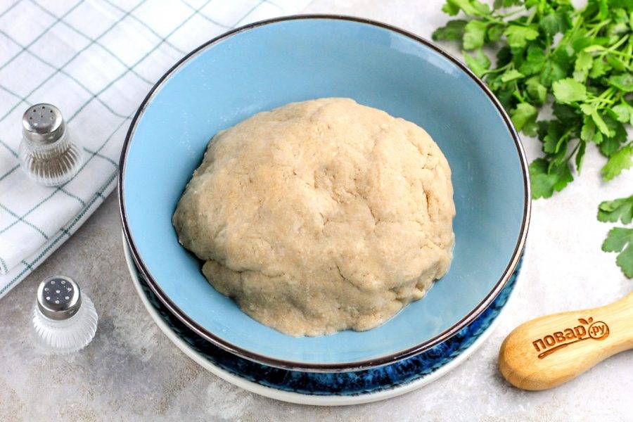 Замесите плотное тесто, подсыпая муку, если это потребуется. Накройте его пищевой пленкой и оставьте на 20 минут в покое.