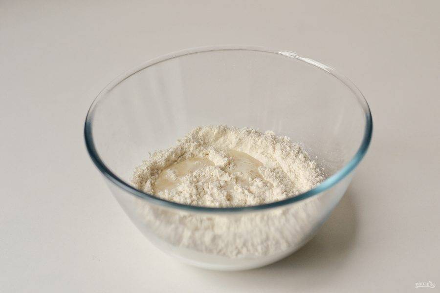 Смешайте муку с солью, затем начните постепенно вливать воду.