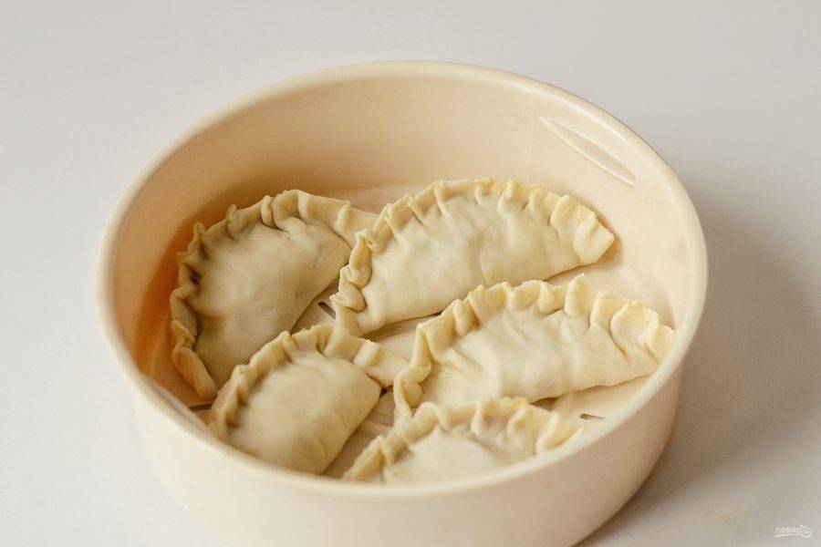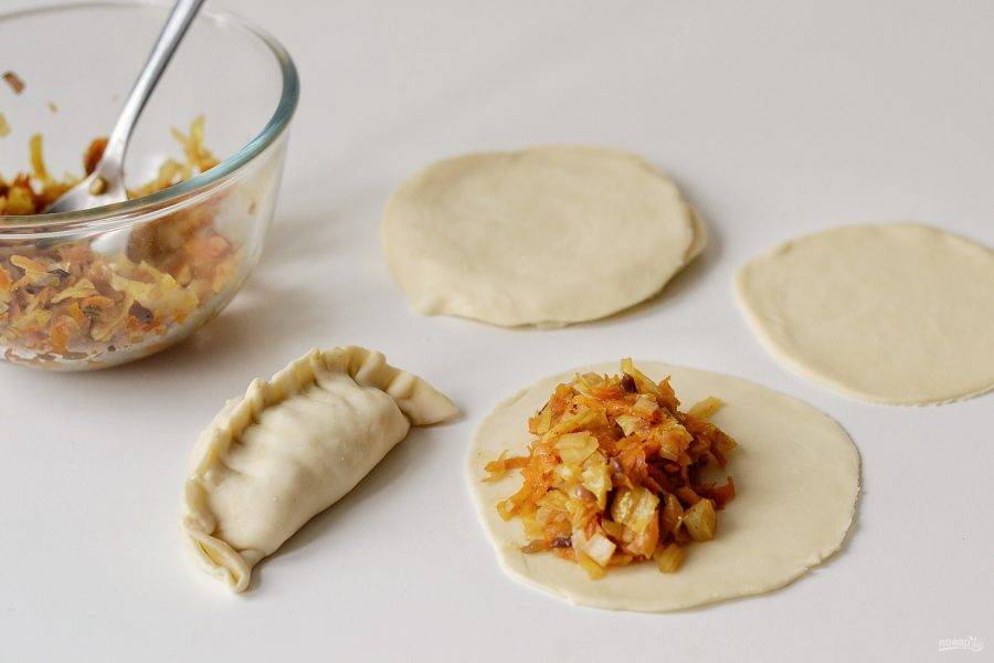 В середину выложите начинку. Защипните края «полумесяцем» с одной стороны.