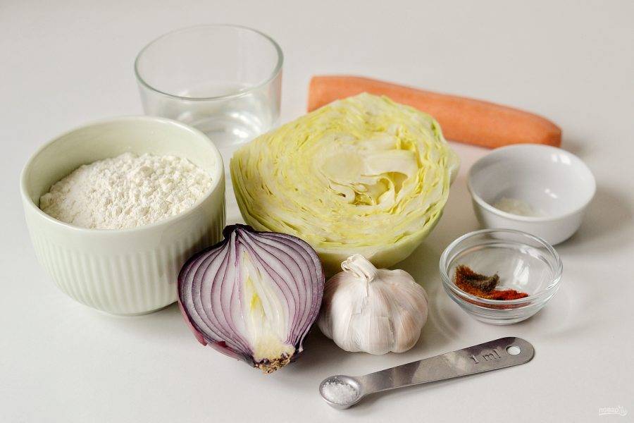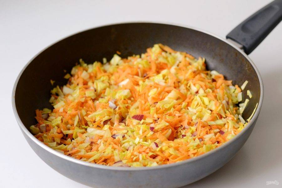 Для начинки мелко порубите овощи. Добавьте специи. Обжарьте их в сковороде до мягкости на кокосовом масле.
