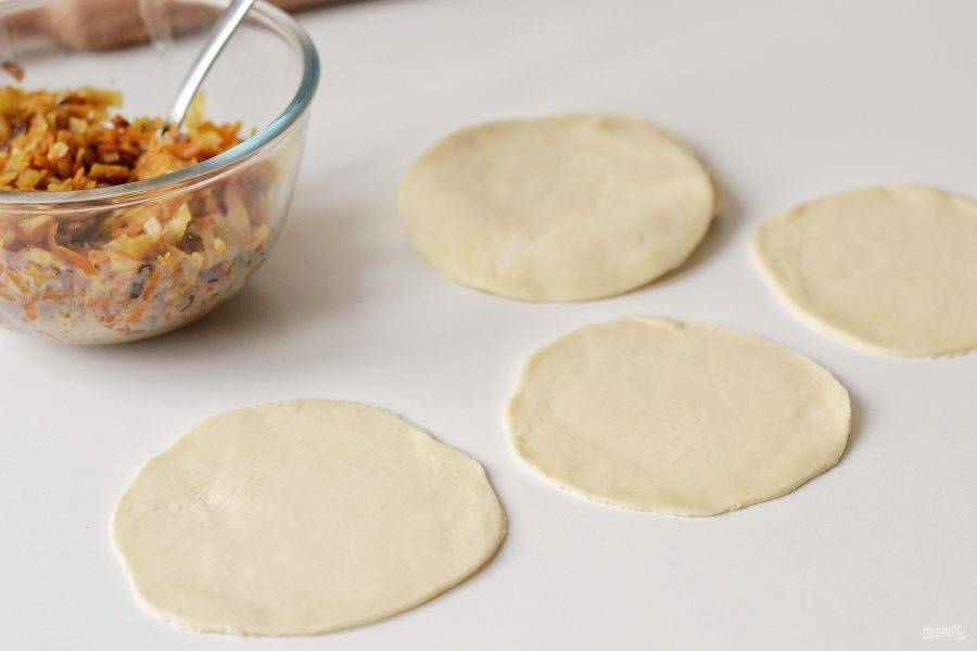 Раскатайте тесто в колбаску, отрежьте небольшие кусочки. Раскатайте их на кружки.