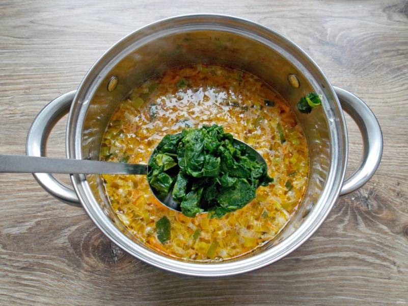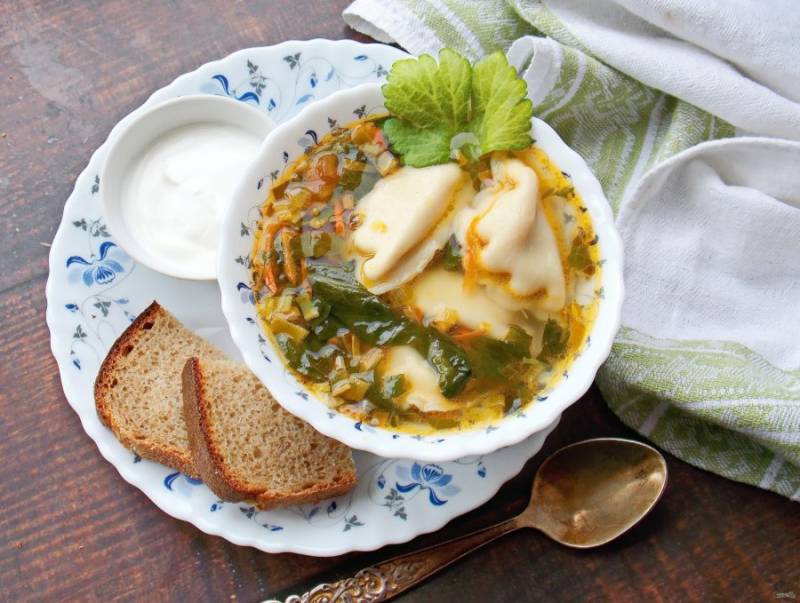 Добавьте в кастрюлю порезанный шпинат и пельмени. Варите в течение 10-15 минут, до готовности пельменей. Снимите с огня и сразу подавайте со сметаной и зеленью.