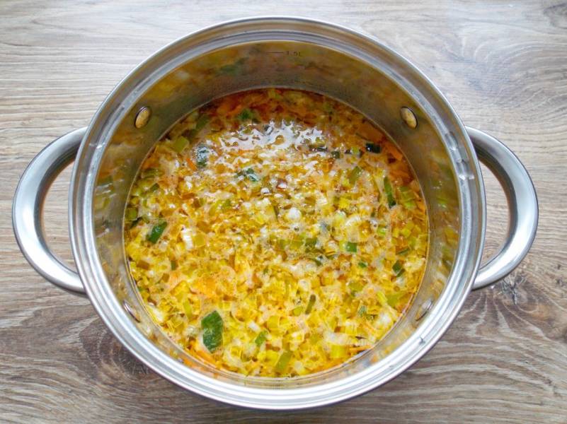 Бульон доведите до кипения, посолите, поперчите и добавьте обжаренные овощи.